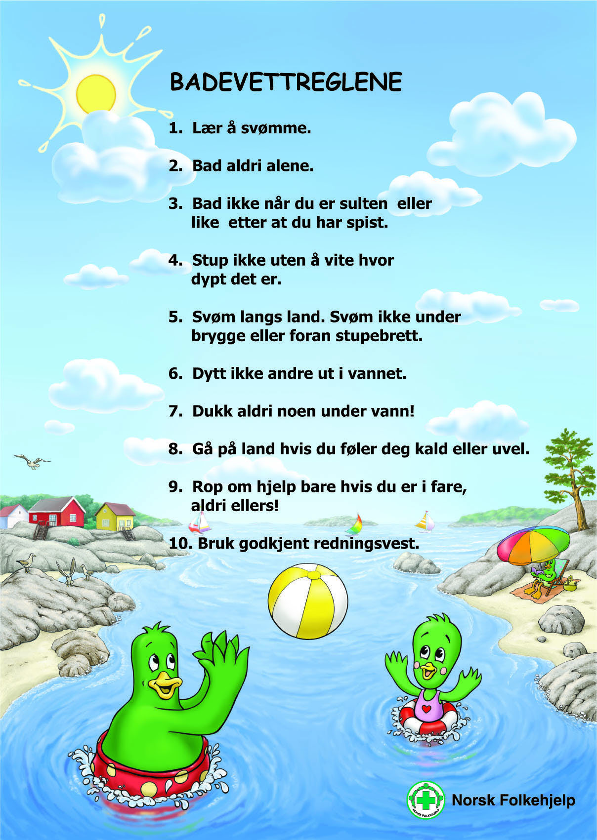Drukningsulykker skjer ofte nær land i forbindelse med lek. Følg med på barn som bader, også om barna er svømmedyktige. Vi kan forebygge drukningsulykker. Følg badevettreglene, hold oppsyn og sett grenser.