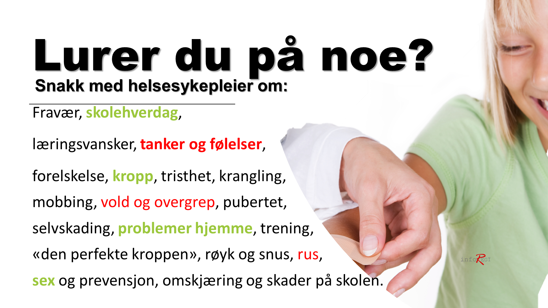 Alle skoler har en helsesykepleier som er tilknyttet skolehelsetjenesten. De jobber forebyggende og helsefremmende for elevene på skolen. Det er gratis og og en lav terskel for å ta kontakt med helsesykepleier.