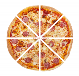 En pizza som deles opp i stykker, er en utmerket anledning til å visualisere brøkuttrykk.